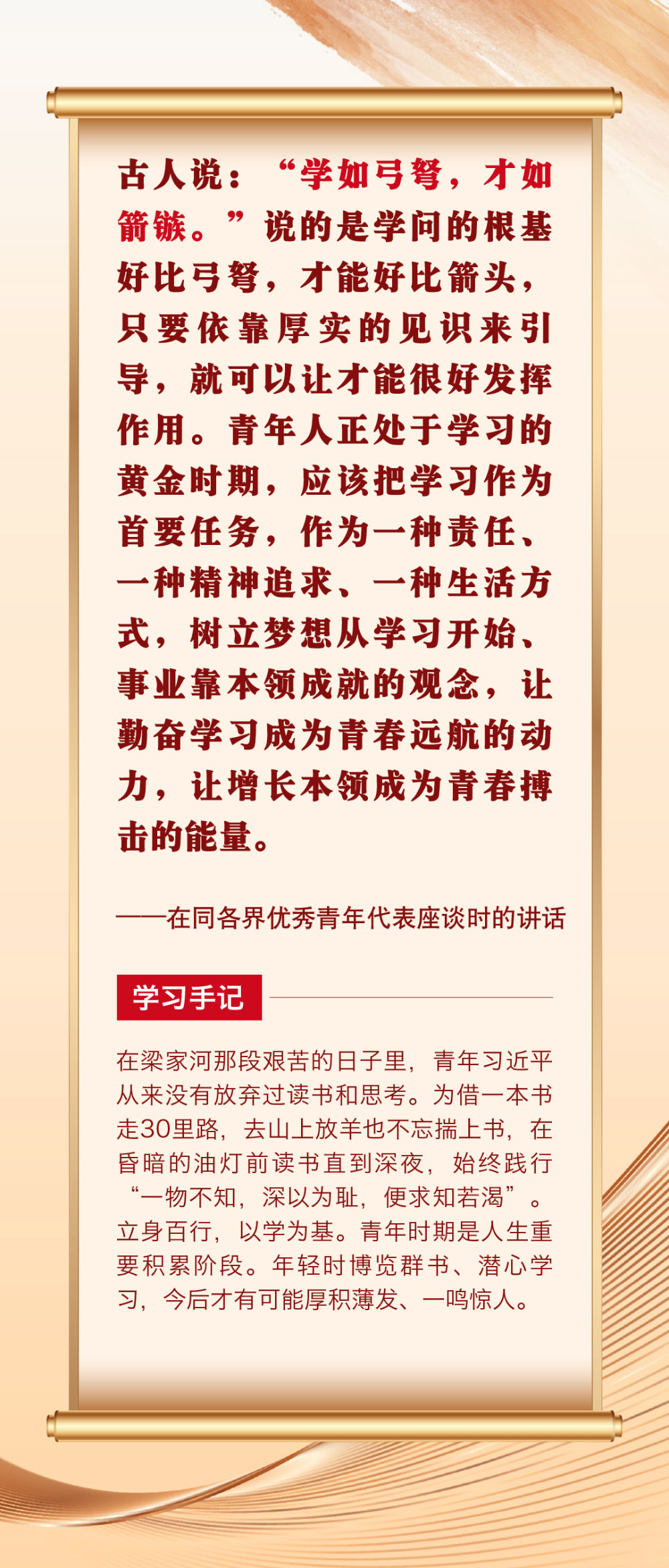 “青年者,國(guó)家之魂。”青年一代以何種精神風(fēng)貌站上時(shí)代舞臺(tái),關(guān)乎祖國(guó)的明天、民族的未來(lái)。黨的十八大以來(lái),習(xí)近平總書(shū)記圍繞青年成長(zhǎng)成才作出許多重要論述。其中,有信手拈來(lái)的精妙典故,有貫古通今的廣征博引,引領(lǐng)廣大青年不斷在中華文化的浸潤(rùn)中堅(jiān)定中國(guó)心、涵養(yǎng)民族魂,成長(zhǎng)為堪當(dāng)復(fù)興重任的時(shí)代新人。
