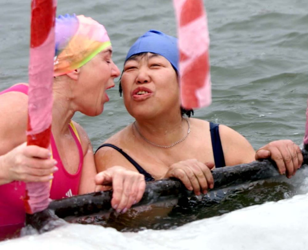 2002年1月15日,多次來(lái)華參加冬泳賽事的俄羅斯選手柳德米拉(左),在第二屆哈爾濱國(guó)際冬泳邀請(qǐng)賽上親吻老朋友、好姐妹——中國(guó)女隊(duì)員楊翠芬。