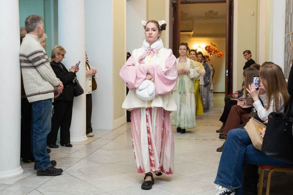 2023年1月30日,觀眾在俄羅斯圣彼得堡舉行的慶祝中國(guó)春節(jié)活動(dòng)上欣賞中式服裝秀。
