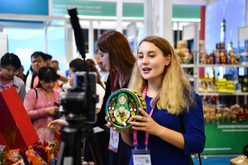 2023年9月19日,來(lái)自俄羅斯的參展商在陜西楊凌農(nóng)高會(huì)展臺(tái)進(jìn)行直播。