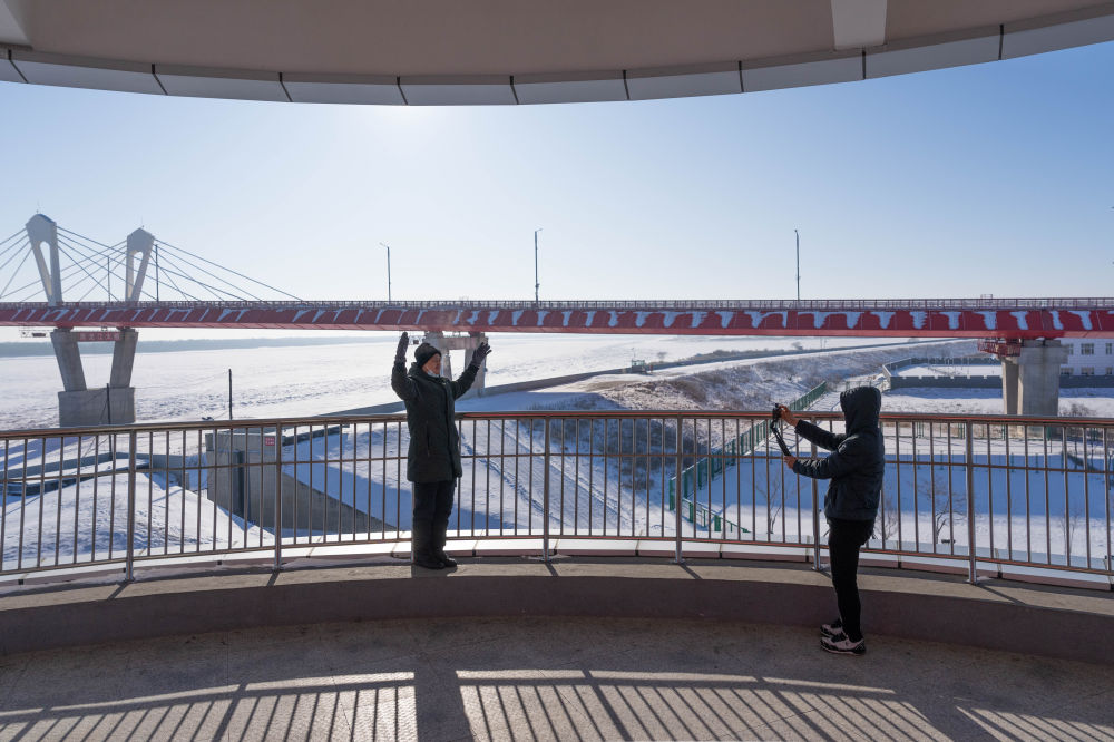 2024年1月30日,游客在黑龍江省黑河市黑龍江大橋公園內(nèi)的觀光塔上留影。黑河—布拉戈維申斯克黑龍江大橋于2022年6月10日正式通車(chē),是中俄首座跨黑龍江(俄羅斯稱(chēng)阿穆?tīng)柡樱┙绾庸窐?,在中?guó)東北地區(qū)和俄羅斯遠(yuǎn)東地區(qū)之間開(kāi)辟了新的國(guó)際運(yùn)輸通道。