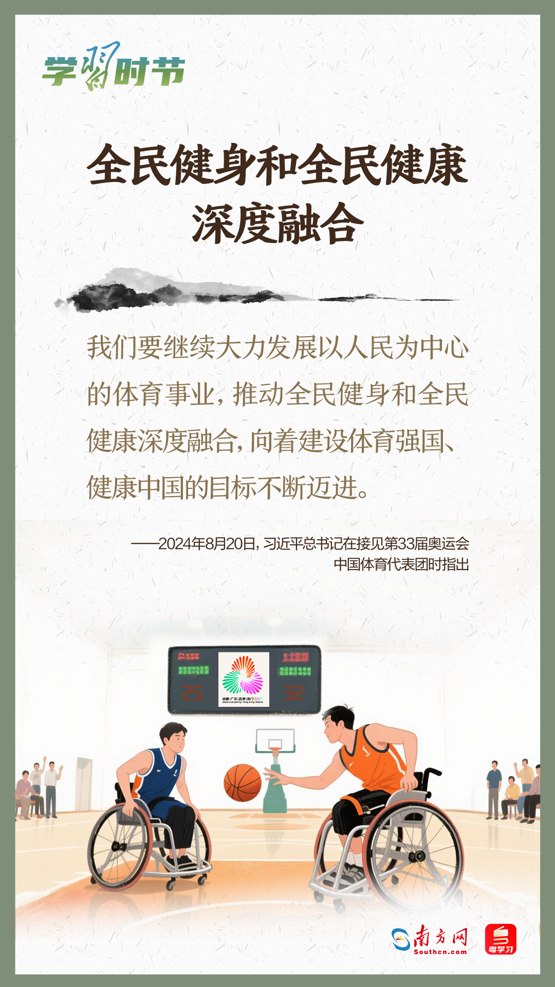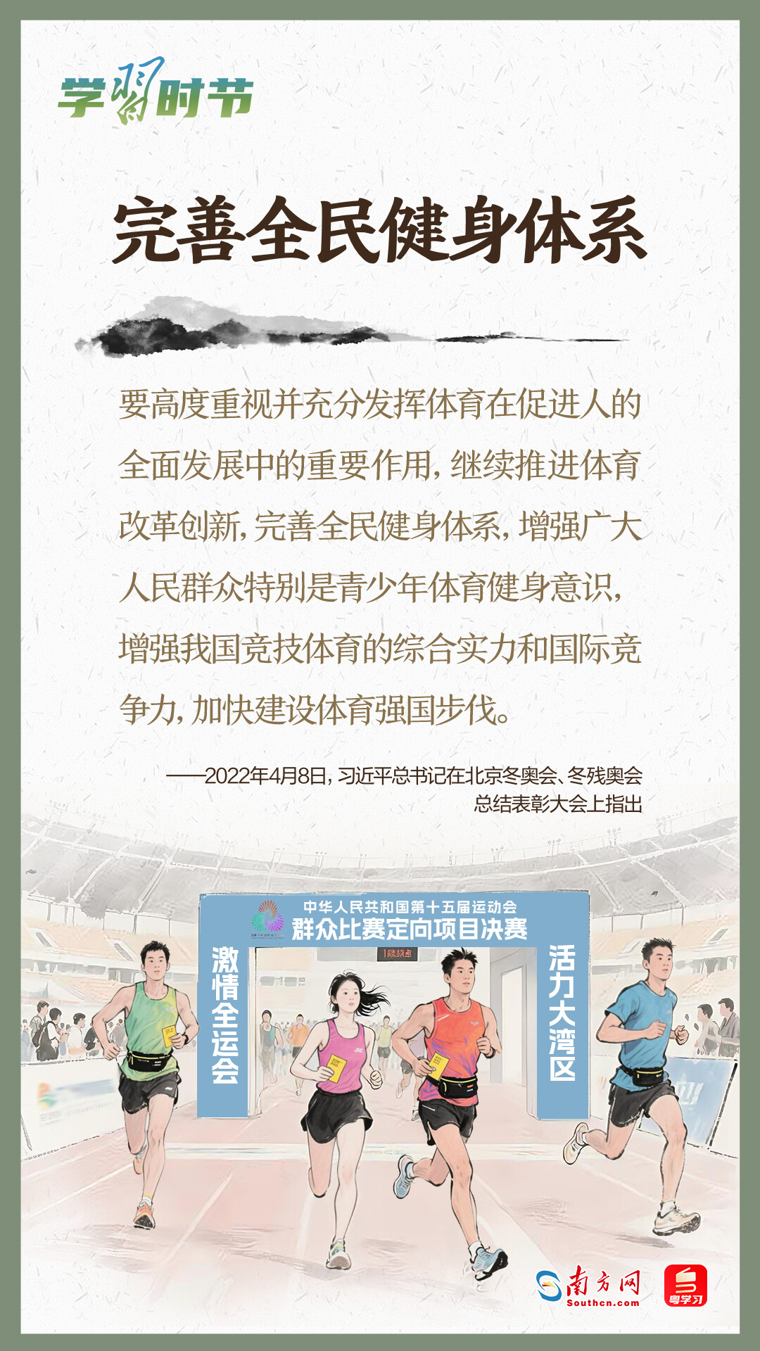 今年5月17日拉開帷幕的第十一屆全民營養(yǎng)周,以“吃動(dòng)平衡 健康體重 全民行動(dòng)”為主題,向全社會(huì)傳遞運(yùn)動(dòng)和飲食在健康生活中同等重要的理念。而今年11月至12月由粵港澳三地共同承辦的十五運(yùn)會(huì)和殘?zhí)貖W會(huì),充分發(fā)揮賽事的“全民性”,將群眾體育發(fā)展推向新高度。