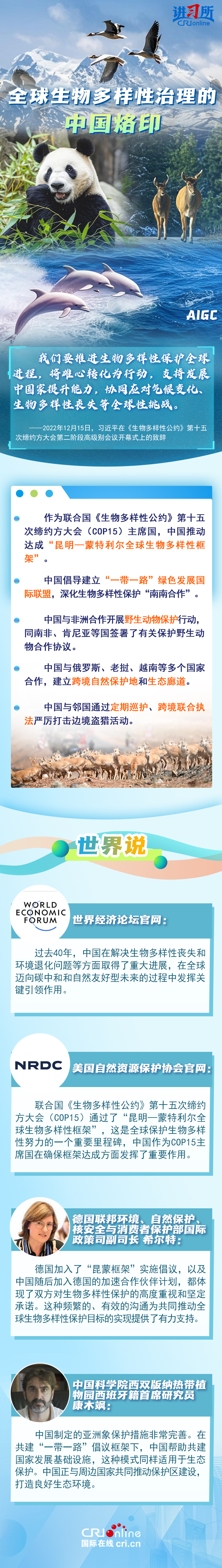 “心往一處想、勁往一處使,共建地球生命共同體。”作為最早簽署、批準(zhǔn)《生物多樣性公約》的締約方之一,生物多樣性保護(hù)已經(jīng)上升為中國(guó)的國(guó)家發(fā)展戰(zhàn)略。國(guó)際人士表示,中國(guó)的一系列舉措體現(xiàn)出對(duì)生態(tài)環(huán)境保護(hù)的堅(jiān)定決心,同時(shí),中國(guó)依托共建“一帶一路”倡議等國(guó)際合作機(jī)制,為推動(dòng)全球生物多樣性保護(hù)提供了有力支持,在邁向自然友好型未來(lái)的過(guò)程中發(fā)揮關(guān)鍵的引領(lǐng)作用。
