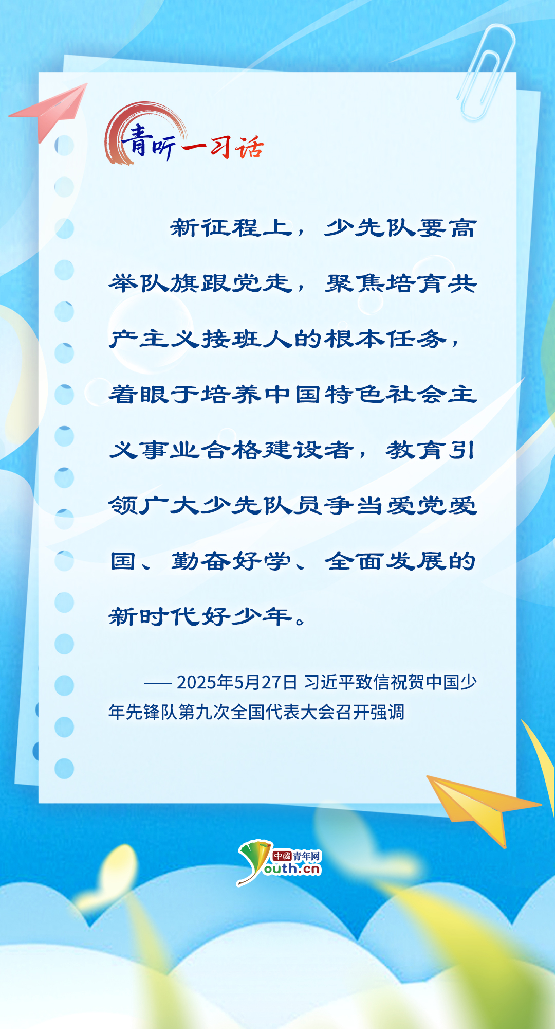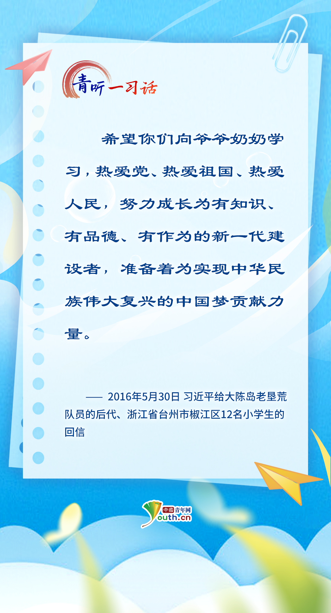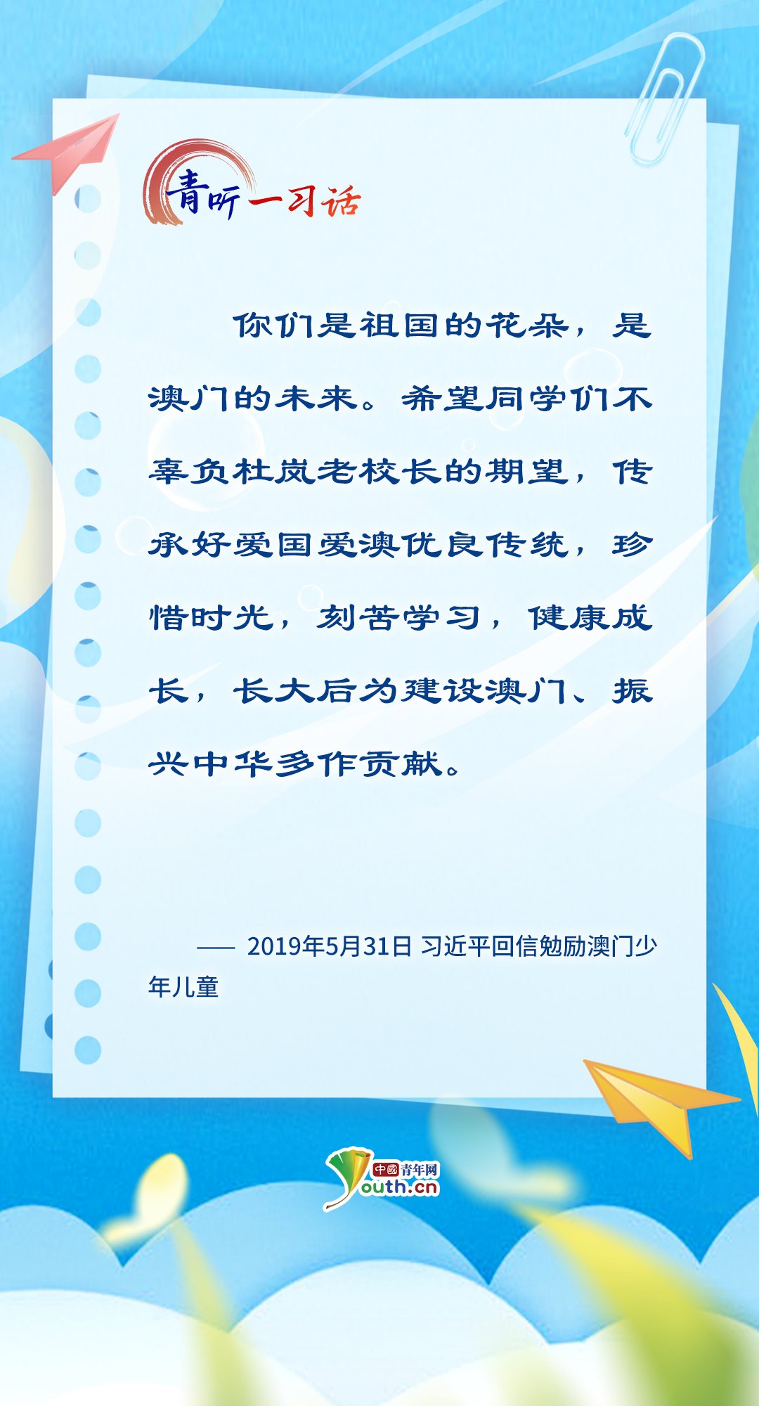 “孩子們成長得更好,是我們最大的心愿?!秉h的十八大以來,習(xí)近平總書記關(guān)心關(guān)愛少年兒童成長成才,為少先隊(duì)工作指明前進(jìn)方向,從“六一”國際兒童節(jié)的殷殷寄語,到外出考察時(shí)的點(diǎn)滴關(guān)懷……少年兒童的健康成長和全面發(fā)展,一直是總書記心中最溫柔的牽掛。在今年“六一”國際兒童節(jié)到來之際,讓我們一起重溫總書記對少年兒童的諄諄教誨、美好祝愿,感受總書記對少年兒童的深情牽掛、殷切期望。(海報(bào)制作:張潔)