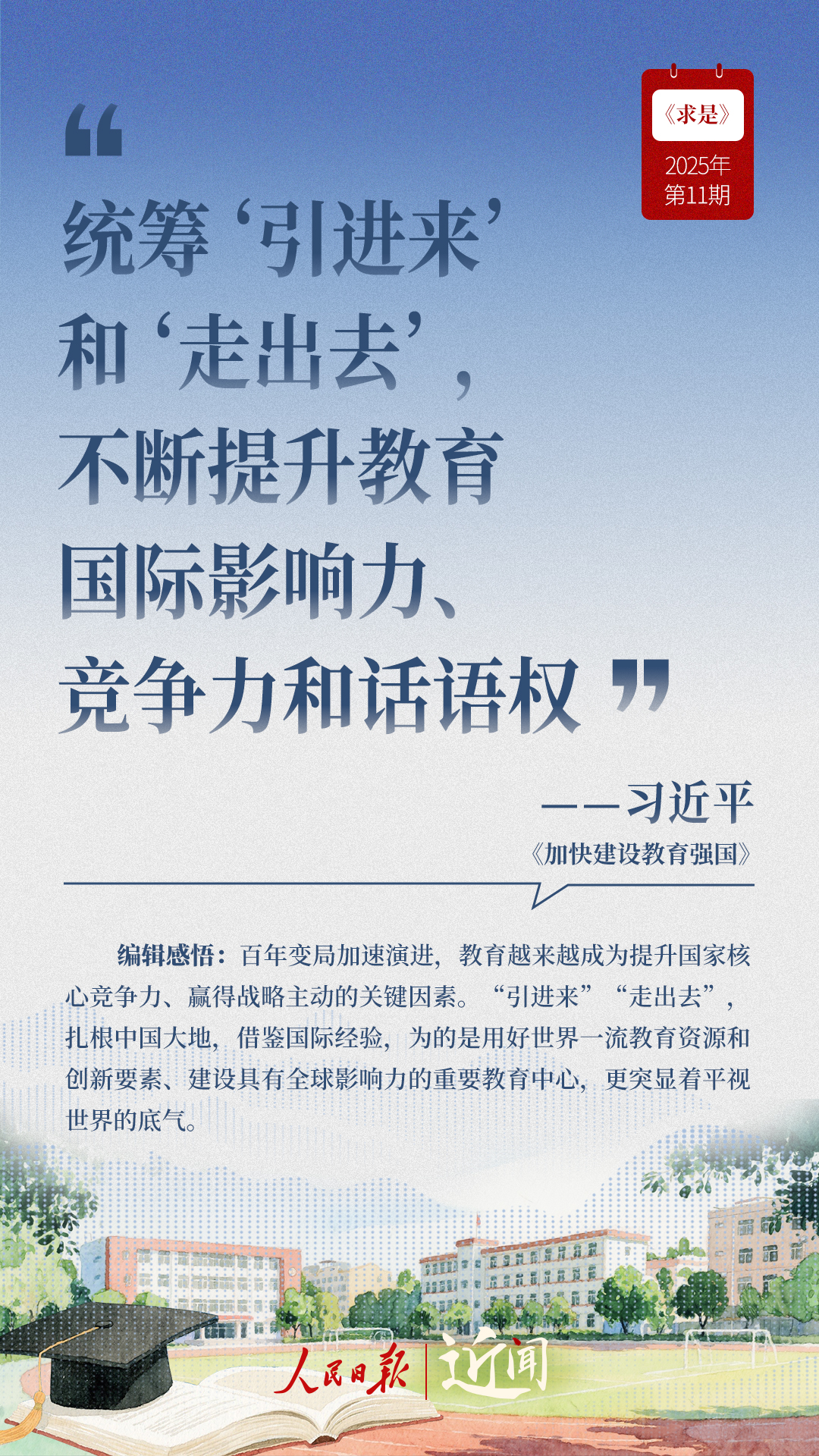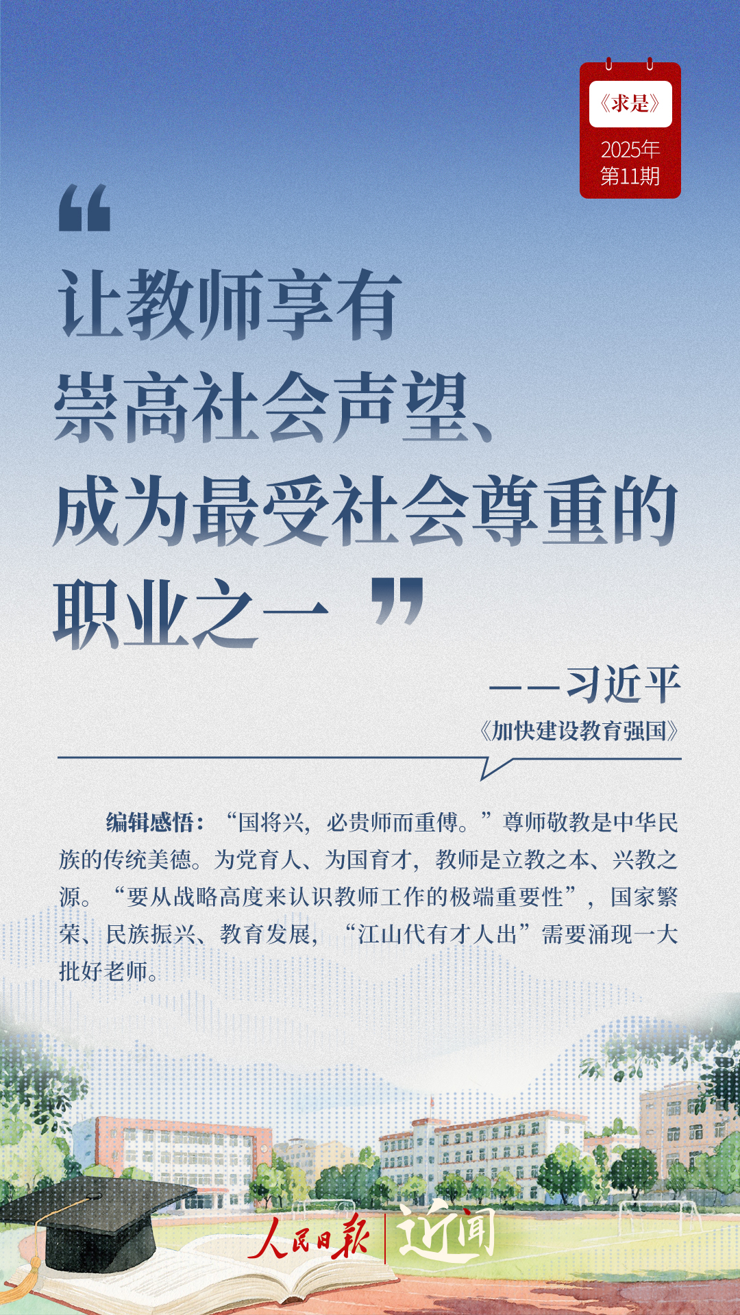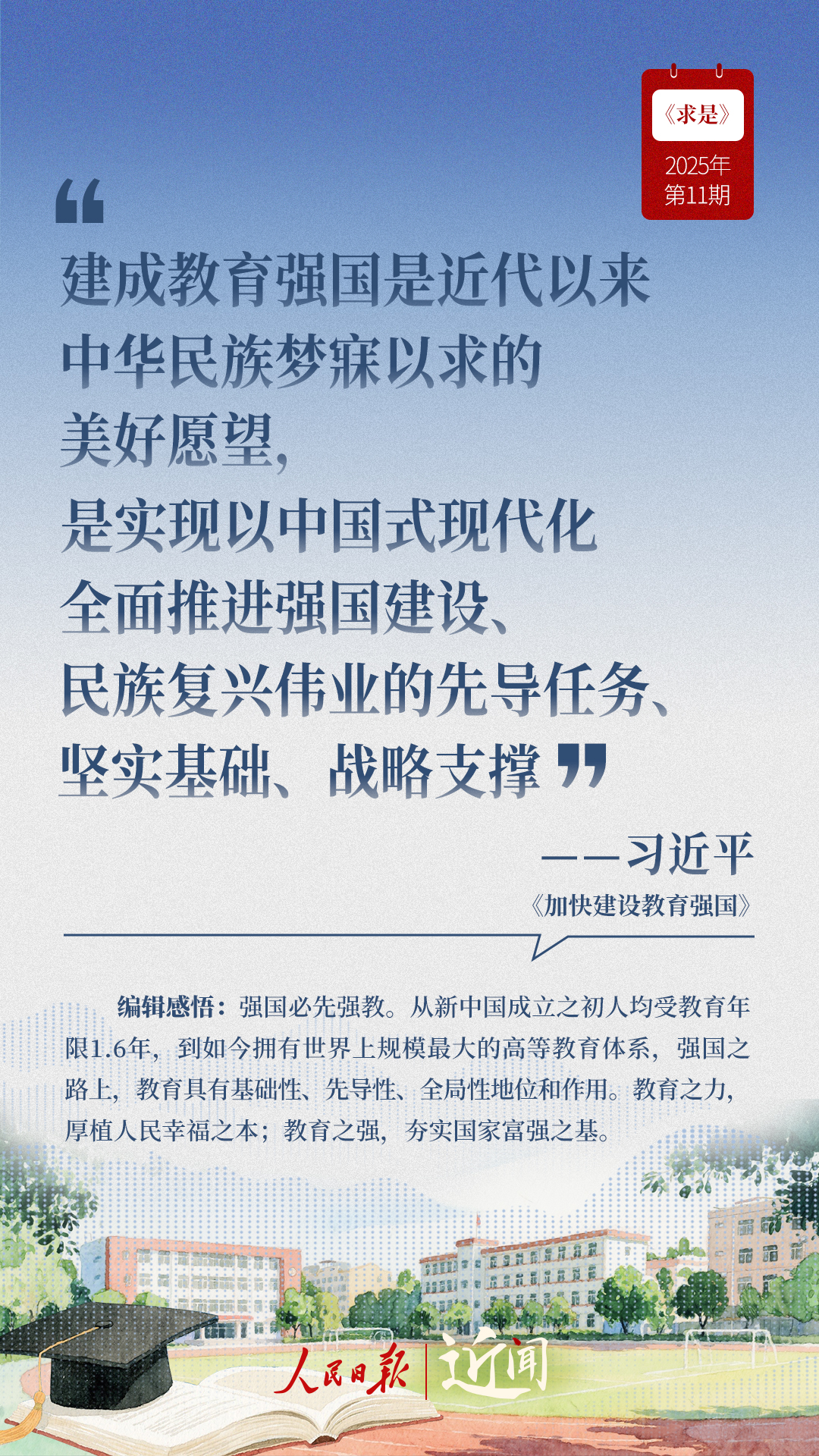 教育是國(guó)之大計(jì)、黨之大計(jì)。日前,《求是》雜志發(fā)表習(xí)近平總書(shū)記重要文章《加快建設(shè)教育強(qiáng)國(guó)》。“全面把握教育的政治屬性、人民屬性、戰(zhàn)略屬性”“讓教育改革發(fā)展成果更多更公平惠及全體人民”“讓教師享有崇高社會(huì)聲望、成為最受社會(huì)尊重的職業(yè)之一”……通過(guò)這些話,一起感悟習(xí)近平總書(shū)記對(duì)教育強(qiáng)國(guó)建設(shè)的謀劃與部署。