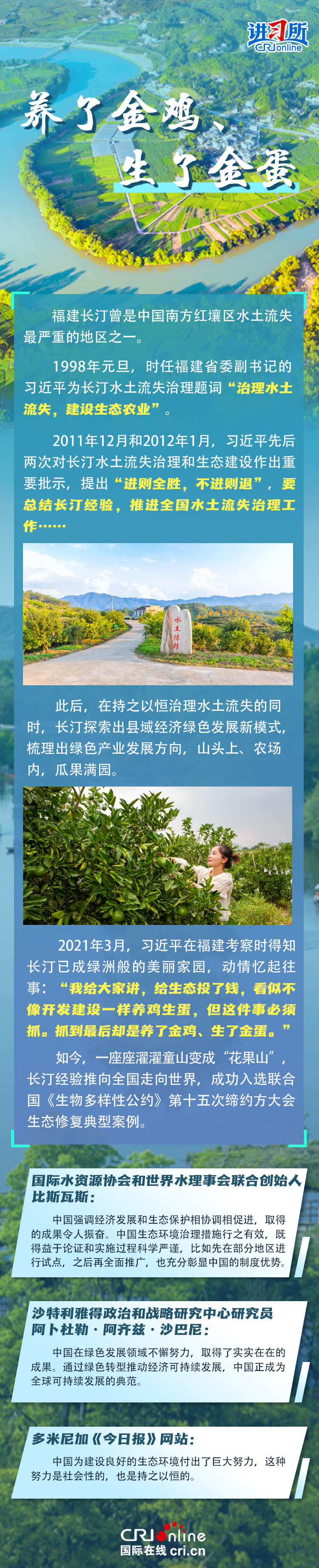 新時(shí)代以來,在習(xí)近平生態(tài)文明思想的科學(xué)指引下,“兩山”理念已深入人心,從“點(diǎn)綠成金”的紅樹林到一座座“花果山”,再到走向世界的長汀經(jīng)驗(yàn)……美麗中國建設(shè)邁出重大步伐,生態(tài)環(huán)境保護(hù)發(fā)生歷史性變化。國際社會認(rèn)為,中國取得廣泛的綠色發(fā)展成就,從根本上源于習(xí)近平生態(tài)文明思想,特別是“兩山”理念的指引。在通過綠色轉(zhuǎn)型推動經(jīng)濟(jì)可持續(xù)發(fā)展方面,中國正成為全球可持續(xù)發(fā)展的典范。