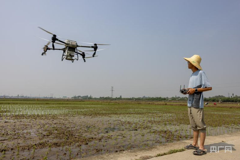 新農(nóng)人王海聰正在操控植保無人機(央廣網(wǎng)發(fā) 侯建明 攝)