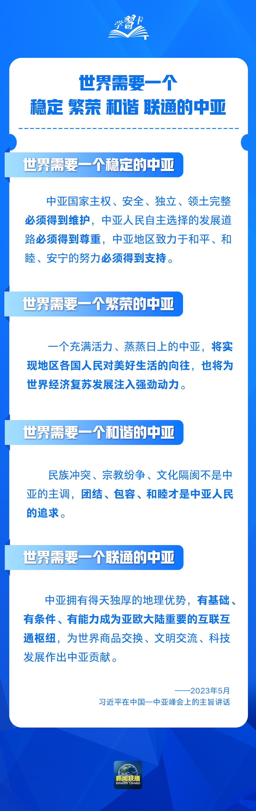 中亞是亞歐大陸的中心,處在聯(lián)通東西、貫穿南北的十字路口。習(xí)近平主席強(qiáng)調(diào),深化中國—中亞合作,是我們這代領(lǐng)導(dǎo)人著眼未來作出的戰(zhàn)略抉擇,順應(yīng)世界大勢,符合人民期盼。