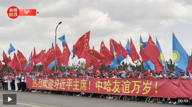 當(dāng)?shù)貢r(shí)間6月16日中午,習(xí)近平主席乘車從機(jī)場(chǎng)赴下榻飯店途中,中資企業(yè)和留學(xué)生代表聚集在道路兩旁,手持“熱烈歡迎習(xí)近平主席!”“中哈友誼萬歲!”等紅色橫幅。哈方直升機(jī)沿途護(hù)衛(wèi),熱烈歡迎習(xí)近平主席到訪。