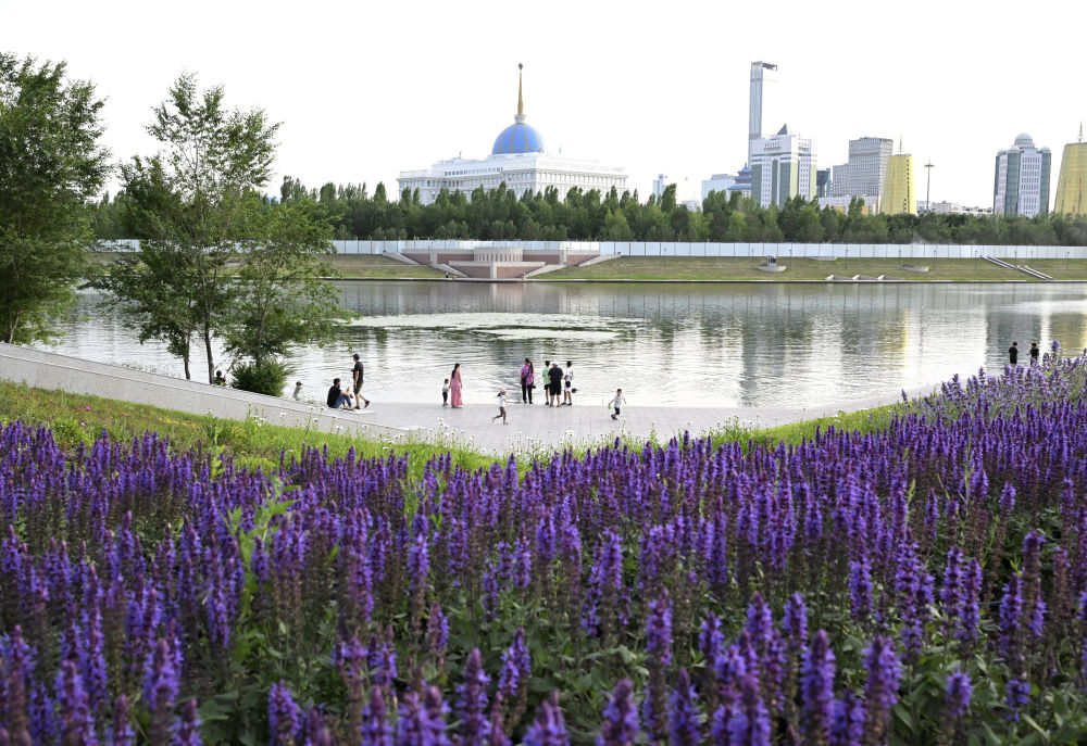 6月13日,人們?cè)诠_克斯坦首都阿斯塔納的伊希姆河畔休閑。 新華社記者 燕雁 攝