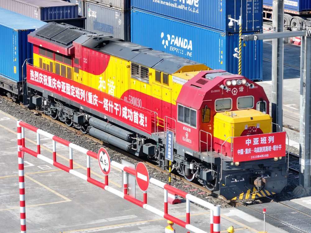 4月20日,圖定中亞班列在重慶團(tuán)結(jié)村中心站等候發(fā)車(chē)(無(wú)人機(jī)照片)。新華社記者 唐奕 攝