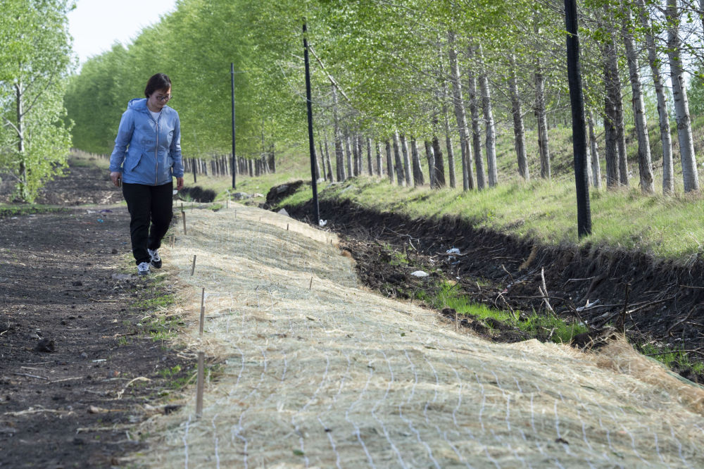 2022年5月23日,在黑龍江省海倫市前進鎮(zhèn)光榮村,黑龍江省農(nóng)業(yè)科學(xué)院科研人員在進行坡面生態(tài)修復(fù)的黑土坡耕地中查看治理情況。