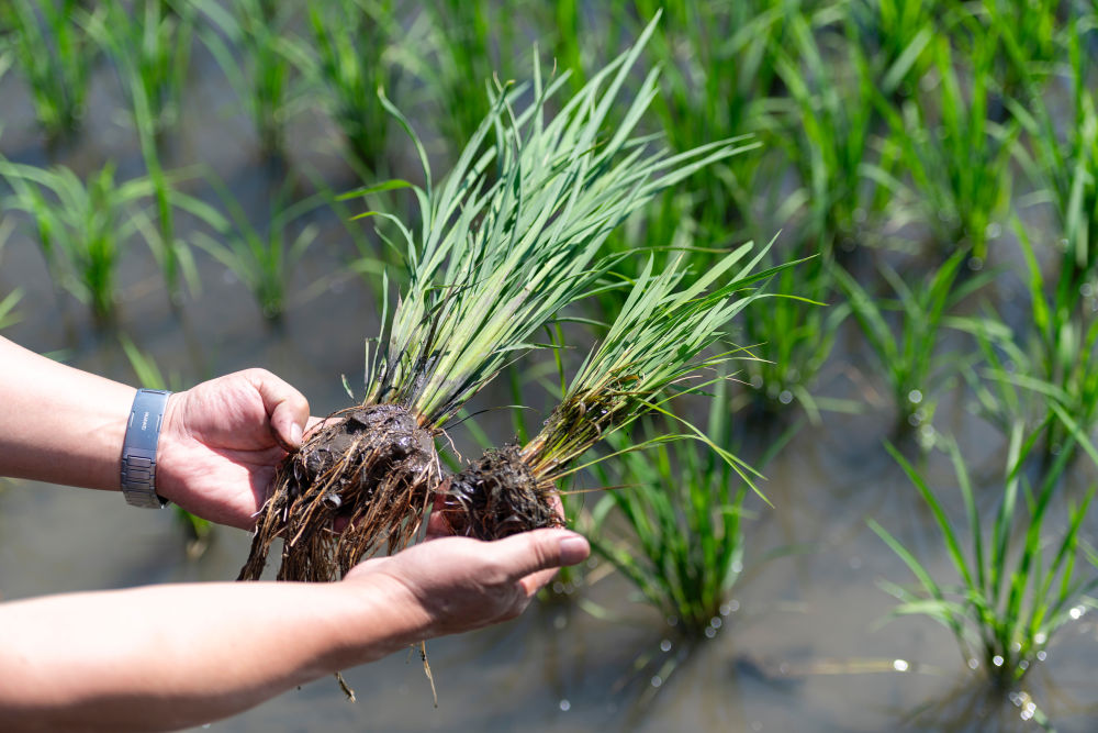 2025年6月18日,在黑龍江省雙鴨山市寶清縣一片水稻田旁,中國水稻研究所北方水稻研究中心科研人員查看應(yīng)用寒地水稻秸稈全量原位還田緩釋多效綜合技術(shù)的水稻(左)與普通水稻的長勢差別。該技術(shù)能夠有效減少化肥用量、提升土壤有機質(zhì)含量,節(jié)約成本、提產(chǎn)增效。