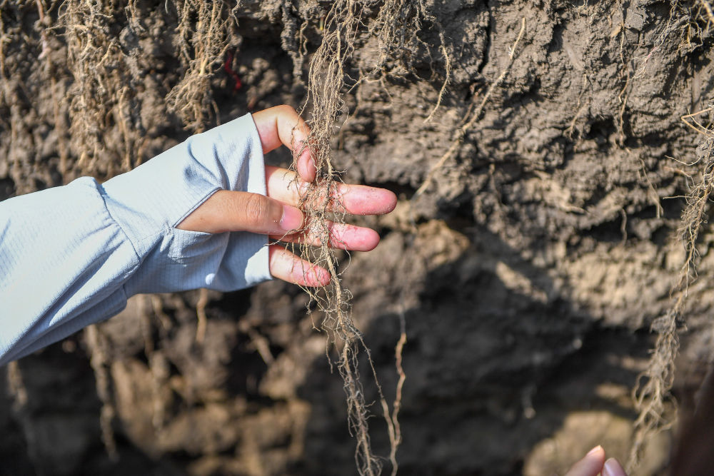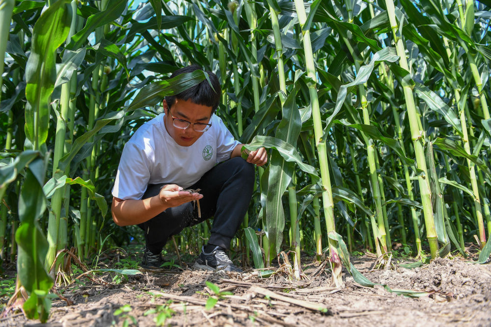 2023年7月31日,在位于吉林省四平市梨樹縣的中國農(nóng)業(yè)大學(xué)“科技小院”保護性耕作試驗田,一名學(xué)生查看玉米根部在黑土中的生長情況。