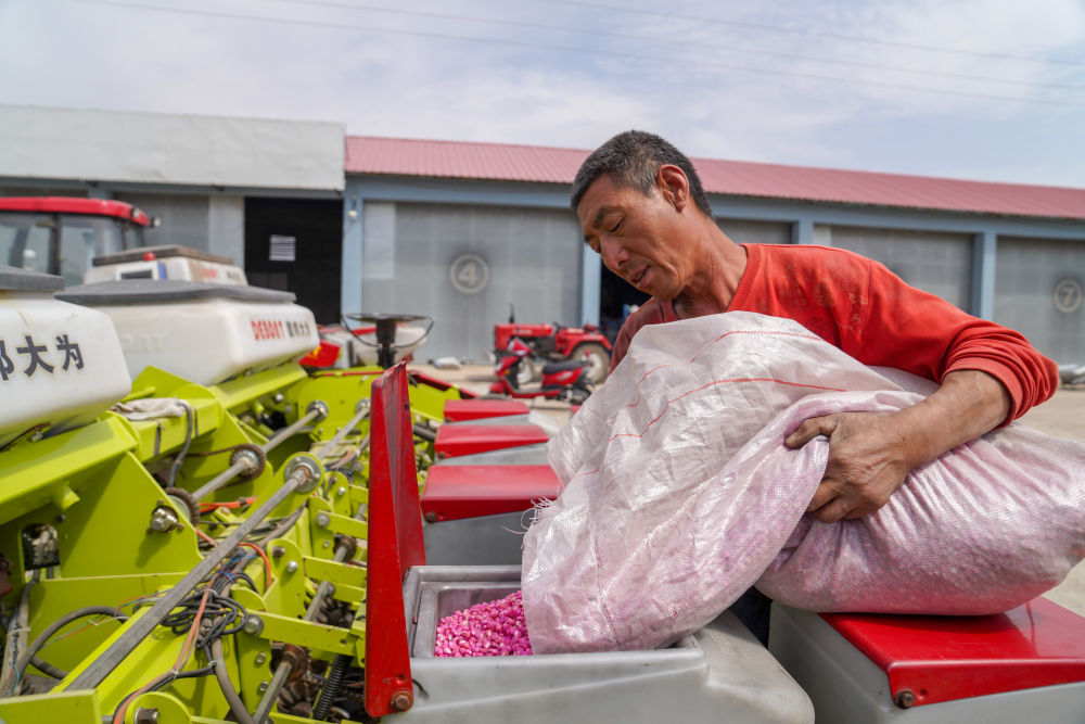 2020年5月7日,在吉林省四平市梨樹縣康達農(nóng)機農(nóng)民專業(yè)合作社,農(nóng)民向免耕播種機里投放玉米種子。