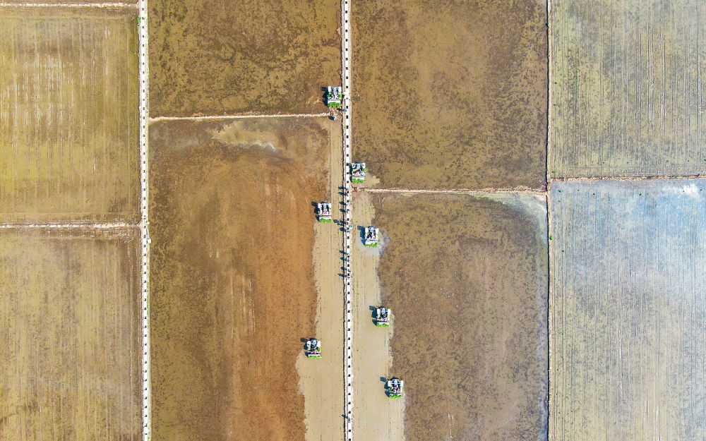 2022年5月13日,在遼寧省鐵嶺市鐵嶺縣新臺子鎮(zhèn),農(nóng)民駕駛農(nóng)機在稻田里插秧(無人機照片)。