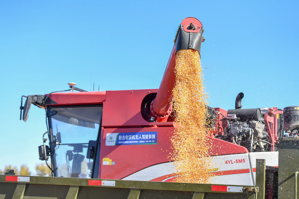 2023年10月19日,在中國科學(xué)院“黑土糧倉”科技會戰(zhàn)長春示范區(qū)公主嶺示范基地,無人駕駛農(nóng)機將收獲的玉米裝車。
