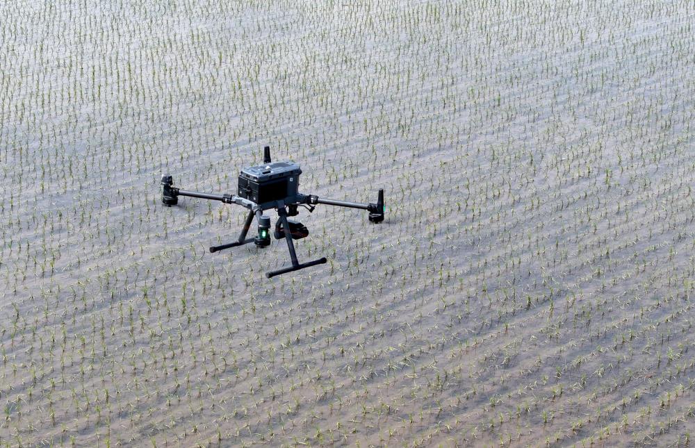 2025年5月21日,在黑龍江省北大荒農(nóng)業(yè)股份八五六分公司第六管理區(qū)農(nóng)業(yè)現(xiàn)代化示范區(qū),搭載多光譜、可見光攝像頭的無人機對水稻插秧后田塊進行土壤墑情監(jiān)測(無人機照片)。
