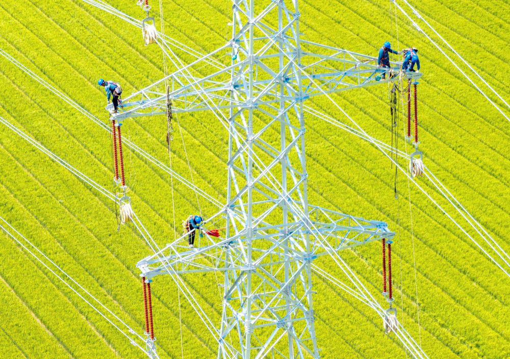 2025年5月4日,電力施工人員在江蘇省揚(yáng)州市江都區(qū)武堅(jiān)鎮(zhèn)至江蘇省興化經(jīng)濟(jì)開(kāi)發(fā)區(qū)的220千伏華電武堅(jiān)25萬(wàn)千瓦集中式光伏項(xiàng)目配套輸電線路上作業(yè)(無(wú)人機(jī)照片)。新華社發(fā)(任飛攝)