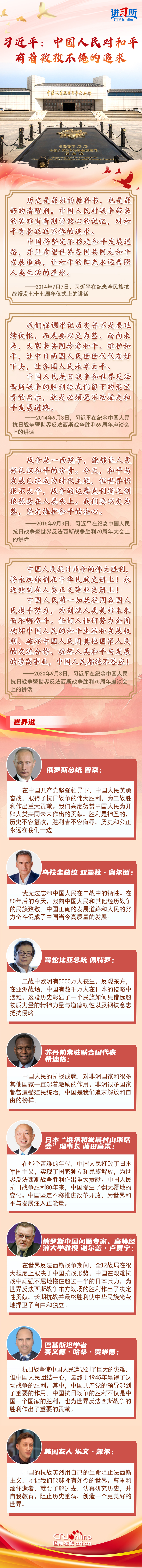 “中國人民抗日戰(zhàn)爭和世界反法西斯戰(zhàn)爭的勝利給我們留下的最寶貴的啟示,就是必須毫不動搖走和平發(fā)展道路?!弊鳛槭澜缟衔ㄒ粚⒑推桨l(fā)展寫入憲法和執(zhí)政黨黨章、上升為國家意志的大國,中國始終從歷史中汲取智慧和力量,堅定捍衛(wèi)來之不易的勝利成果。在國際友好人士眼中,中國為世界反法西斯戰(zhàn)爭東方戰(zhàn)場的勝利作出了決定性貢獻,中國正確的發(fā)展道路和人民的努力奮斗促成了中國當今高質(zhì)量的發(fā)展,為世界和平與發(fā)展注入正能量。