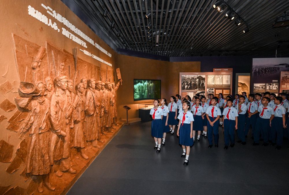 2025年7月7日上午,北京市第十二中學(xué)的少先隊(duì)員參觀紀(jì)念全民族抗戰(zhàn)爆發(fā)88周年儀式暨《為了民族解放與世界和平》主題展覽。新華社記者 陳曄華 攝