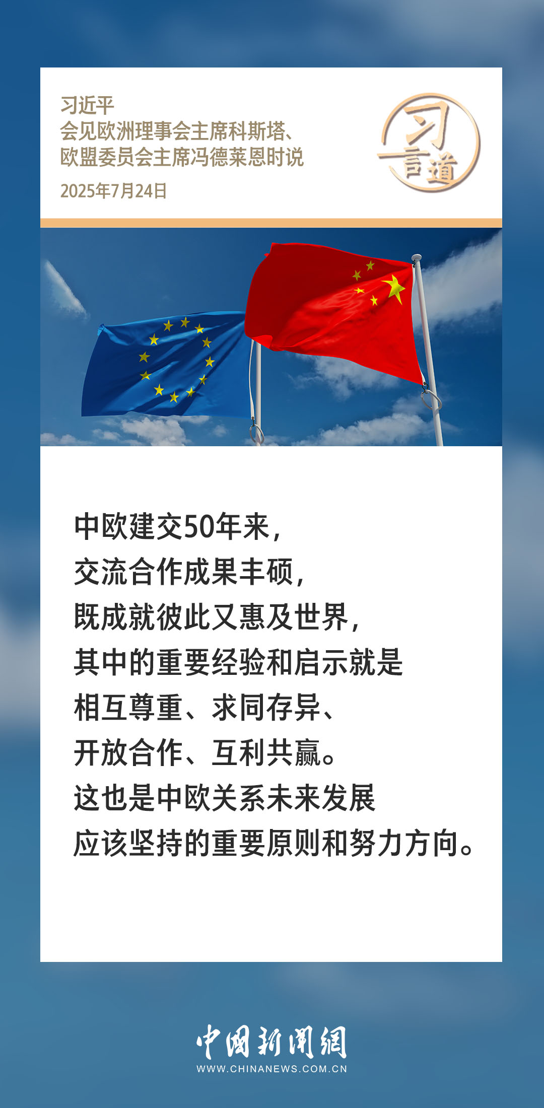 7月24日,國家主席習(xí)近平在北京人民大會堂會見來華舉行第二十五次中國-歐盟領(lǐng)導(dǎo)人會晤的歐洲理事會主席科斯塔和歐盟委員會主席馮德萊恩。習(xí)近平指出——
