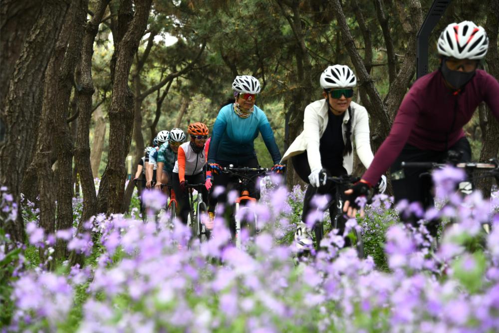 2025年4月19日,自行車運動愛好者在山東日照的海濱騎行綠道騎行。