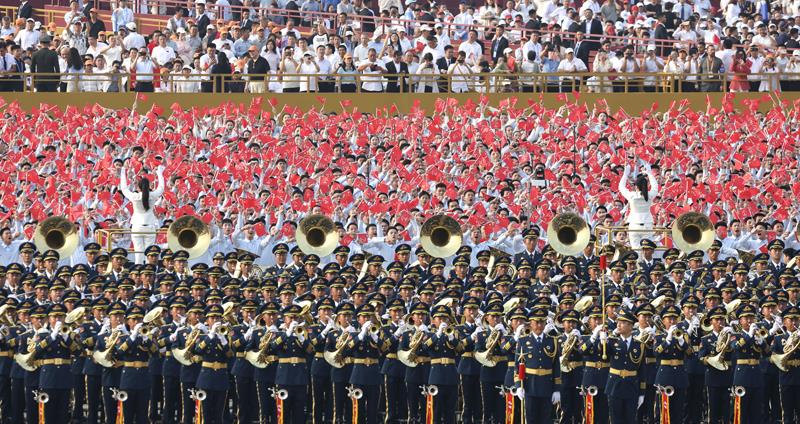 紀(jì)念大會(huì)開始前,天安門廣場(chǎng)上,千人聯(lián)合軍樂(lè)團(tuán)演奏四首歌曲,合唱團(tuán)唱響《松花江上》《在太行山上》《保衛(wèi)黃河》《沒(méi)有共產(chǎn)黨就沒(méi)有新中國(guó)》。