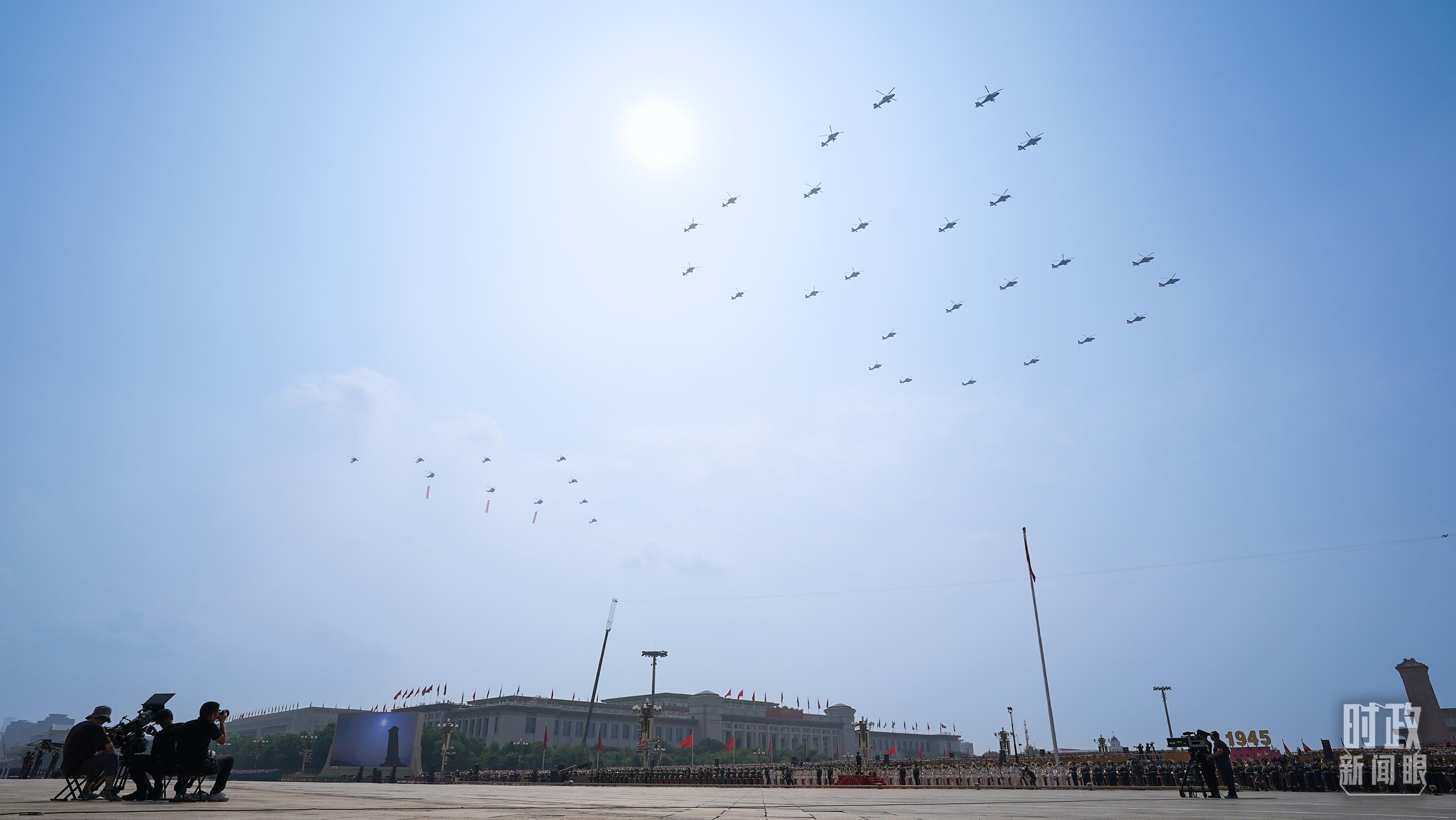 △9月3日,3架直升機(jī)分別懸掛“正義必勝”“和平必勝”“人民必勝”條幅飛過天安門廣場。(總臺(tái)記者李晉拍攝)