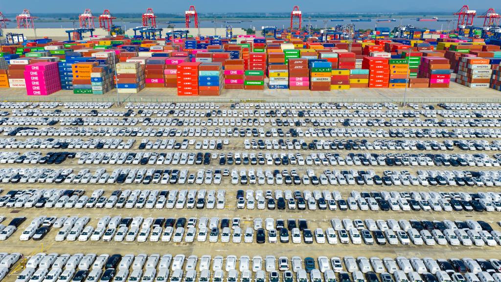 圖為10月4日在江蘇省港口集團(tuán)南京港龍?zhí)陡蹍^(qū)拍攝的準(zhǔn)備裝船出口的汽車(chē)(無(wú)人機(jī)照片)。新華社發(fā)(楊素平攝)