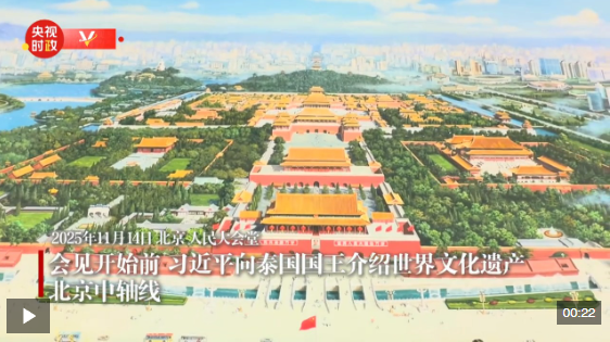 會見開始前,習(xí)近平向泰國國王介紹世界文化遺產(chǎn)——北京中軸線。