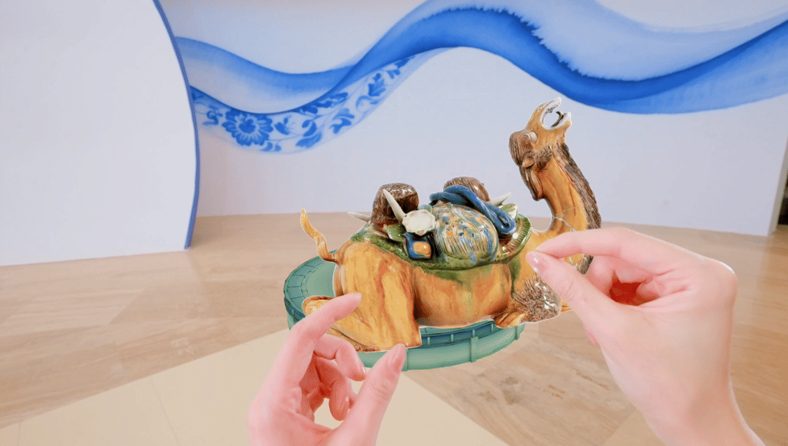 “這款MR眼鏡使用的就是3D技術(shù),該技術(shù)能夠清晰地將文物的紋飾紋樣、顏色、形制等信息采集下來。戴上MR眼鏡后,觀眾能夠放大縮小、旋轉(zhuǎn)文物,增強了觀看體驗?!崩钤凑f。