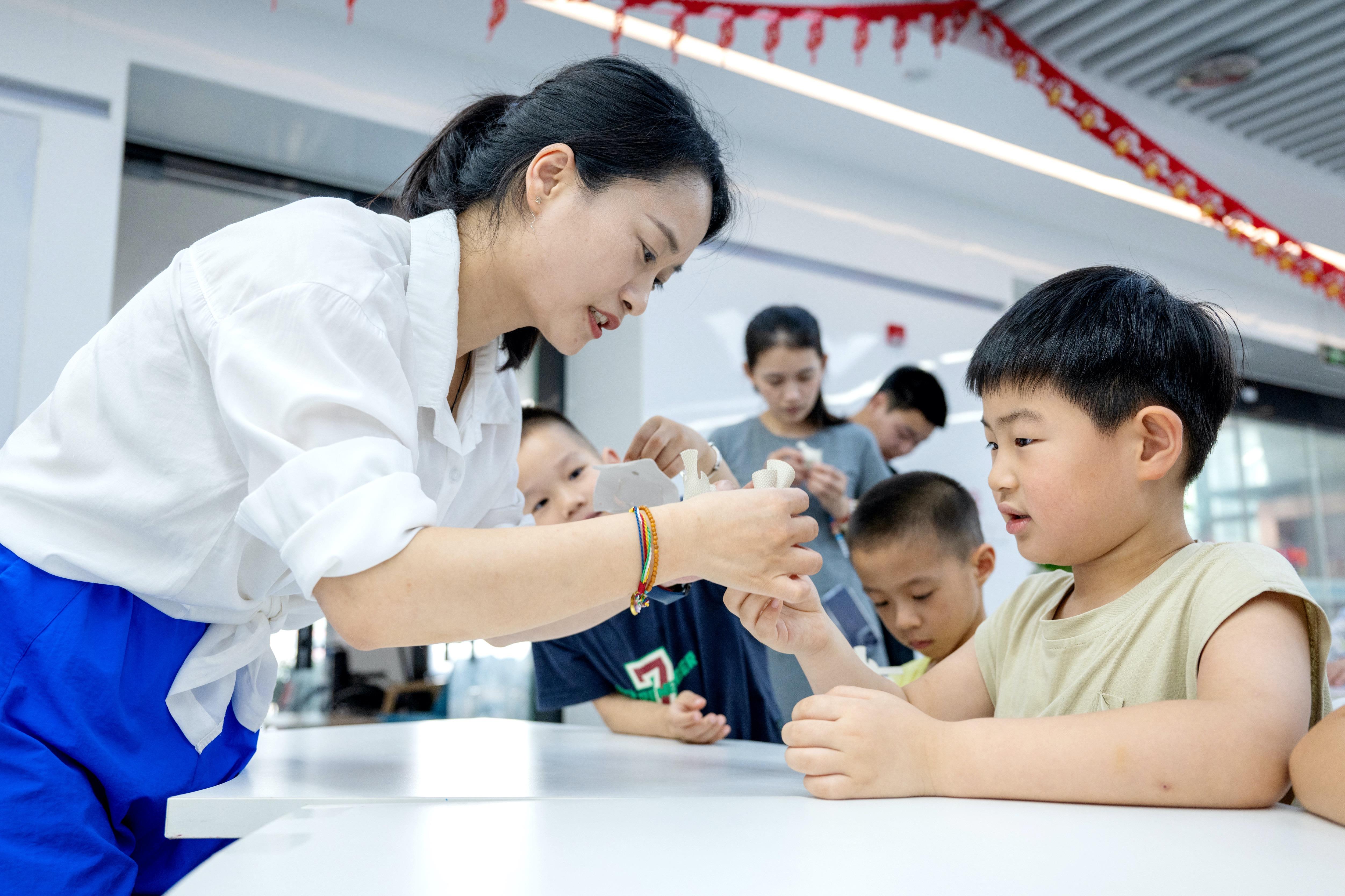 2025年7月3日,浙江湖州長興縣龍山街道齊北社區(qū)幸福鄰里中心,志愿者指導(dǎo)孩子們制作手工。