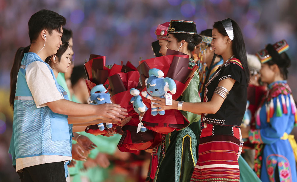 2024年11月30日,五十六個(gè)民族代表在海南三亞舉行的第十二屆全國(guó)少數(shù)民族傳統(tǒng)體育運(yùn)動(dòng)會(huì)閉幕式上為志愿者獻(xiàn)花。運(yùn)動(dòng)會(huì)期間,數(shù)千名志愿者“小鹿鹿”奔赴十余個(gè)競(jìng)賽場(chǎng)館、二十多家接待酒店、媒體中心、機(jī)場(chǎng)車站等地,為來自全國(guó)各地的運(yùn)動(dòng)員、技術(shù)官員、工作人員和觀眾提供禮賓接待、交通引導(dǎo)、安全保衛(wèi)等志愿服務(wù)。