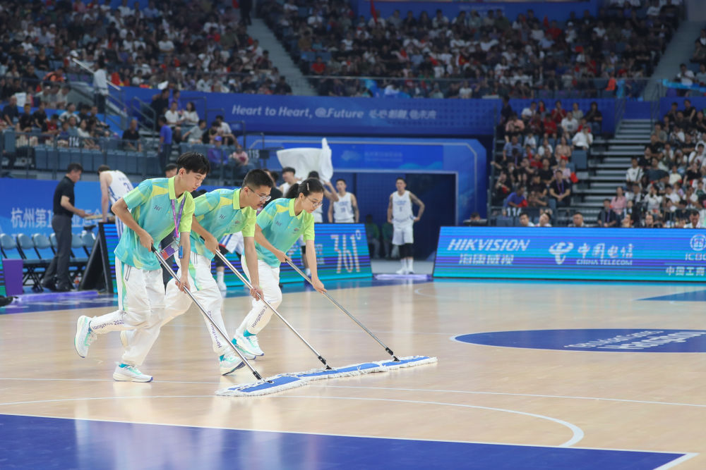 2023年9月28日,杭州亞運(yùn)會(huì)志愿者“小青荷”在杭州亞運(yùn)會(huì)籃球男子預(yù)賽B組比賽前清潔場(chǎng)地。從2016年二十國(guó)集團(tuán)領(lǐng)導(dǎo)人杭州峰會(huì)以來,“小青荷”這一志愿服務(wù)工作品牌已成為杭州大型賽會(huì)服務(wù)的一張金名片。