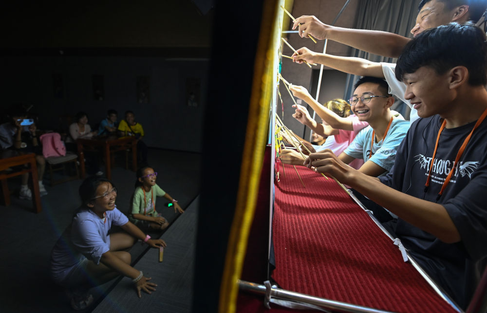 2023年8月8日,進行暑期研學的學生在位于西安的中國秦腔藝術(shù)博物館里體驗皮影戲演出。