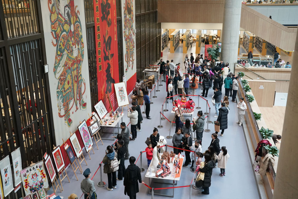 2025年1月1日,觀眾在位于西安的陜西省圖書館高新館區(qū)內(nèi)參觀一場非遺文化展覽。西安市持續(xù)推出各類主題和形式的公共文化活動,為市民、游客提供豐富的精神文化生活。