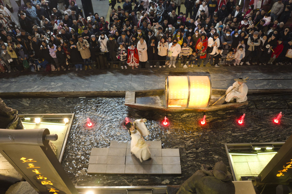 游客在西安大唐不夜城景區(qū)觀看以唐代歷史文化為背景創(chuàng)作的情景?。o人機照片,2025年1月22日攝)。