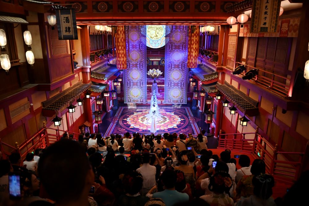 2024年5月12日,游客在西安長安十二時辰主題街區(qū)內(nèi)觀看演出。街區(qū)通過漢服旅拍、演藝互動、非遺體驗等項目,讓游客“穿越”回盛唐長安,為游客打造科技感、文化味十足的游歷體驗。