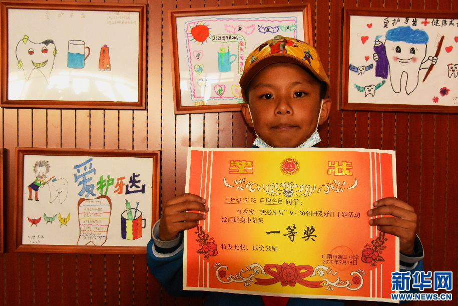 三年級學(xué)生旦增洛色所作的繪畫“愛護(hù)牙齒”得了一等獎(jiǎng),現(xiàn)場拿到獎(jiǎng)狀的他很是興奮?!笆迨灏⒁虃兘o我們講了很多愛護(hù)牙齒的知識(shí),還叮囑我們要養(yǎng)成刷牙的好習(xí)慣?!钡┰雎迳f,“我會(huì)把了解到的這方面知識(shí),告訴身邊所有人,讓他們也都有健康的牙齒?!?/p>