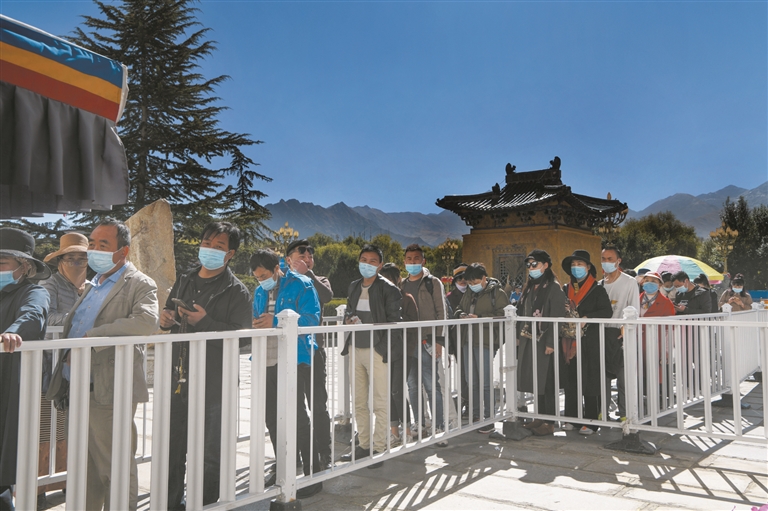 圖為游客佩戴口罩排隊(duì)進(jìn)布達(dá)拉宮參觀。記者 貢嘎來(lái)松攝