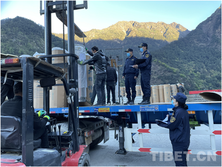 圖為聶拉木海關(guān)關(guān)員正在對援尼物資進行現(xiàn)場監(jiān)管