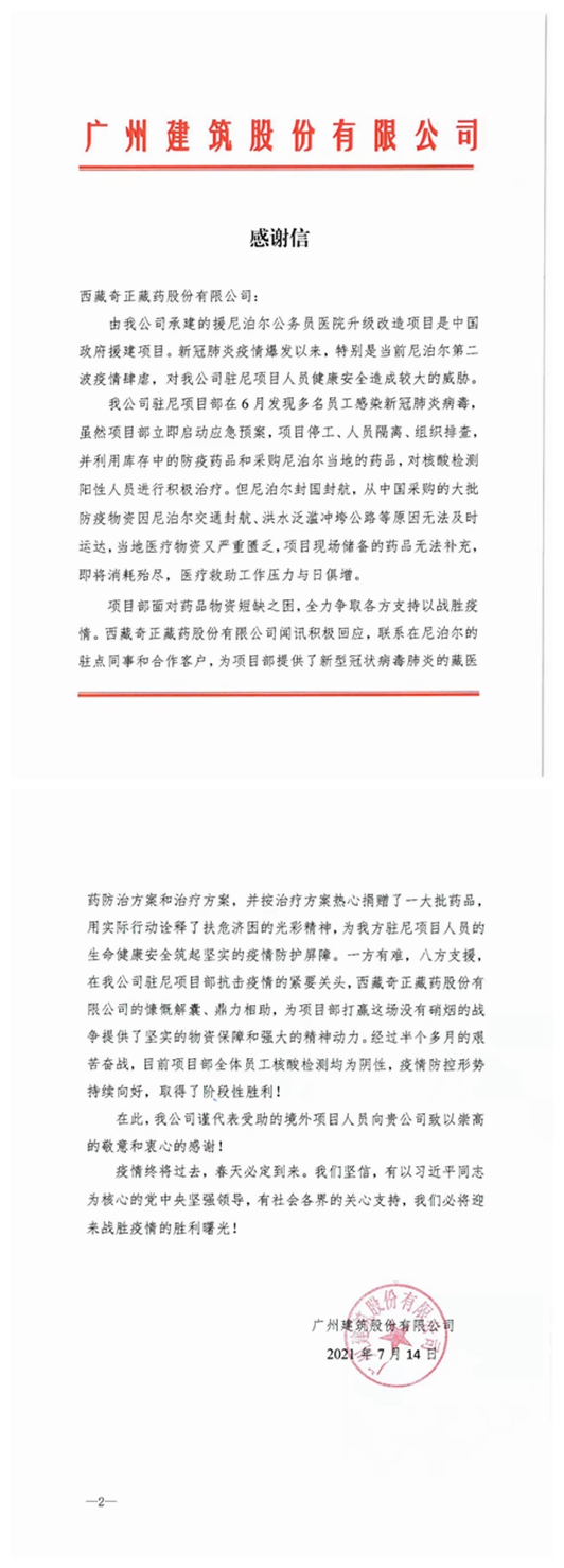 患者經(jīng)多次核酸檢測轉(zhuǎn)陰未復(fù)陽后,廣州建筑集團(tuán)特地給西藏奇正藏藥股份有限公司寫了一份感謝信,信中寫到:西藏奇正藏藥股份有限公司為項(xiàng)目部提供了新型冠狀病毒肺炎的藏醫(yī)藥防治方案和治療方案,并按治療方案熱心捐贈(zèng)了一大批藥品,用實(shí)際行動(dòng)詮釋了扶危濟(jì)困的光彩精神,為我方駐尼項(xiàng)目人員的生命健康安全筑起堅(jiān)實(shí)的疫情防護(hù)屏障。一方有難,八方支援,在我公司駐尼項(xiàng)目部抗擊疫情的緊要關(guān)頭,西藏奇正藏藥股份有限公司的慷慨解囊、鼎力相助,為項(xiàng)目部打贏這場沒有硝煙的戰(zhàn)爭提供了堅(jiān)實(shí)的物資保障和強(qiáng)大的精神動(dòng)力。