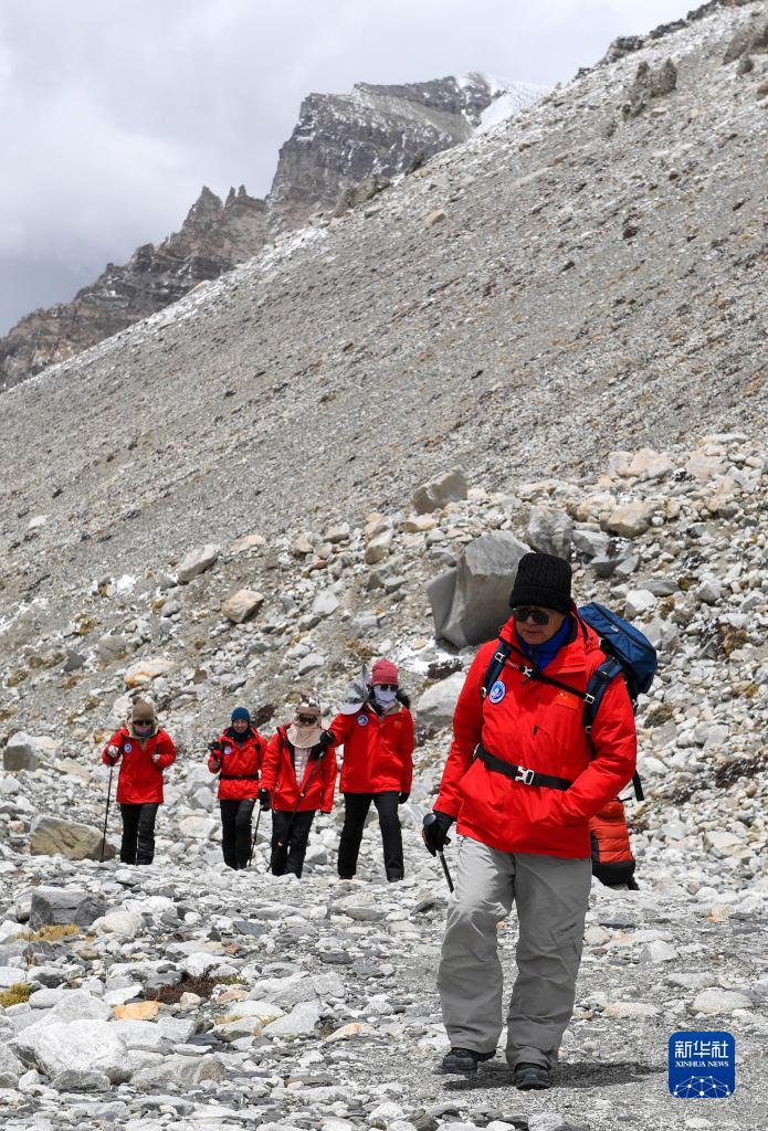 朱彤(左二)和科研人員在珠峰登山大本營(yíng)和絨布冰川間徒步穿梭(5月1日攝)。新華社記者 姜帆 攝