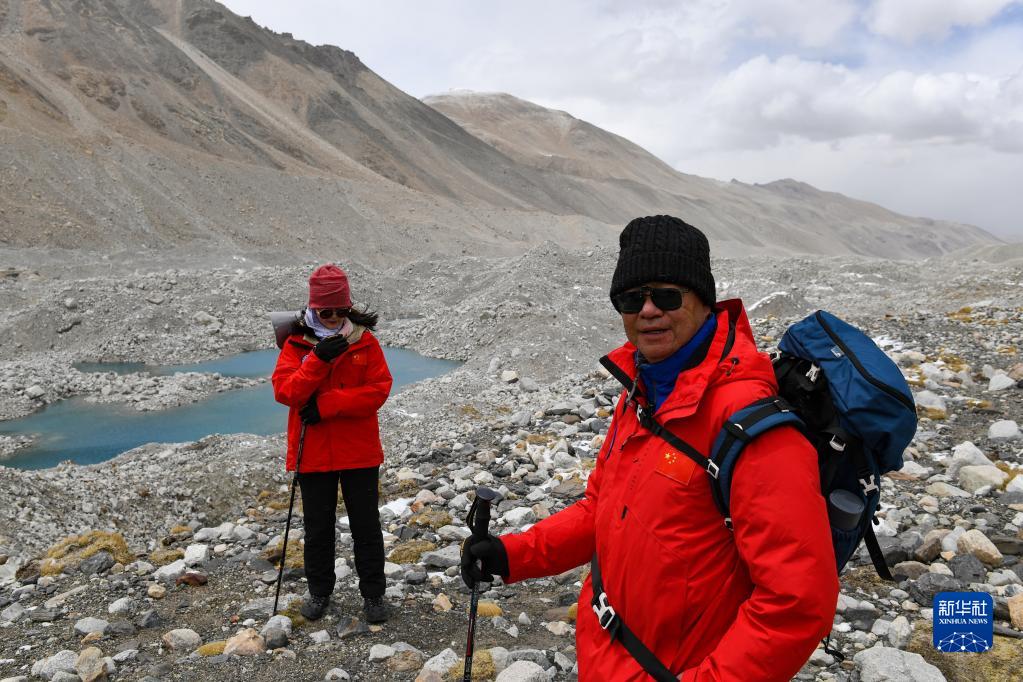 朱彤(右)和科研人員在珠峰登山大本營(yíng)和絨布冰川間徒步穿梭(5月1日攝)。新華社記者 姜帆 攝