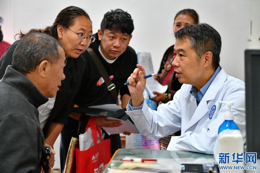 在西藏自治區(qū)第二人民醫(yī)院,首都醫(yī)科大學(xué)附屬北京天壇醫(yī)院神經(jīng)外科主任醫(yī)師曹勇(右一)為患者(左一)診?。?019年8月31日攝)。新華社記者 張汝鋒 攝