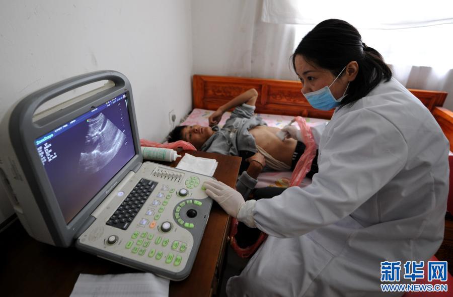 安徽省援藏醫(yī)療人員在西藏山南市錯(cuò)那縣勒門巴民族鄉(xiāng)為當(dāng)?shù)卮迕馚超檢查腹腔,進(jìn)行包蟲病篩查(2017年8月7日攝)。新華社記者 晉美多吉 攝