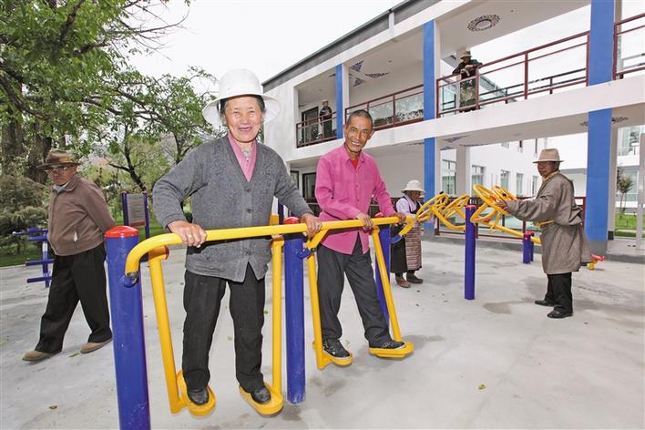 拉薩市城關(guān)區(qū)蔡公堂鄉(xiāng)敬老院老人在鍛煉身體。