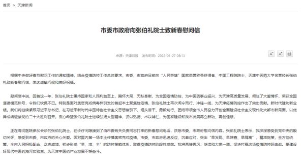 近日,天津市委、市政府向“人民英雄”國(guó)家榮譽(yù)稱號(hào)獲得者、中國(guó)工程院院士、天津中醫(yī)藥大學(xué)名譽(yù)校長(zhǎng)張伯禮致新春慰問信,表達(dá)誠(chéng)摯問候和美好祝福。