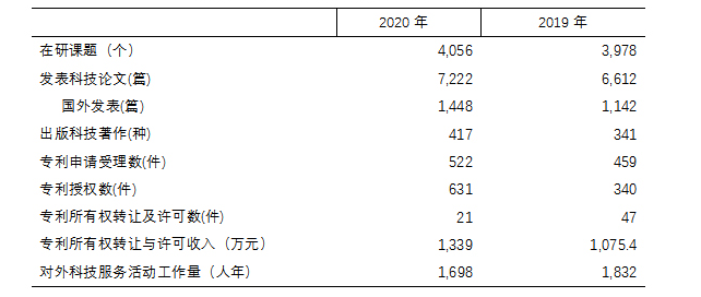 2020年全國中醫(yī)藥科研機(jī)構(gòu)在研課題共4,056個(gè),比2019年的3,978個(gè)增加了78個(gè),增幅2.0%。發(fā)表科技論文7,222篇,其中國外發(fā)表1,448篇,出版科技著作417種。比2019年全國中醫(yī)藥科研機(jī)構(gòu)發(fā)表的6,612篇科技論文增加了610篇,增幅為9.2%。